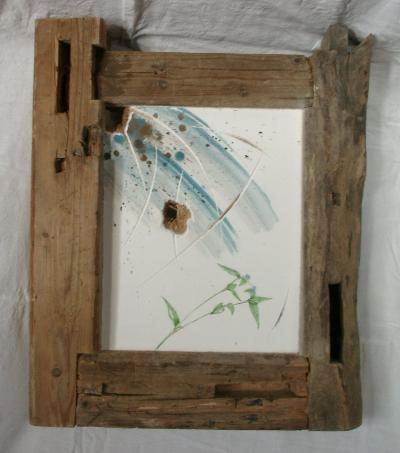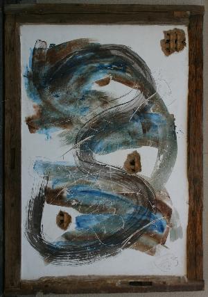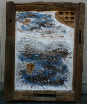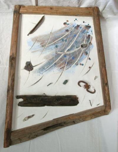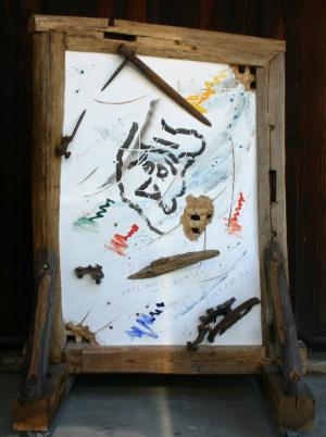 作品タイトル title 瀬戸内からの贈り物 gifts from the sea サイズ size 100 X 80 X 20 cm 素材 medium 廃木材 漆喰 岩絵の具 海岸収集物 salvaged wood, lime, Japanese rockcolor[Iwa-enogu] ,collectives on the seashore