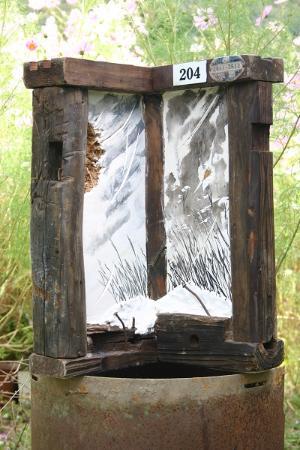 作品タイトル title 204号室の四季 the four seasons at the room 204 サイズ size 50 X 50 X 50 cm 素材 medium 古民家廃木材 土壁(竹、稲わら、縄、土、漆喰) 岩絵の具 墨 油彩 水彩 salvaged wood from old houses, bamboo, rice straw, mud, lime, Japanese rock color[Iwa-enogu], china black ink [Sumi], oil and watercolor |