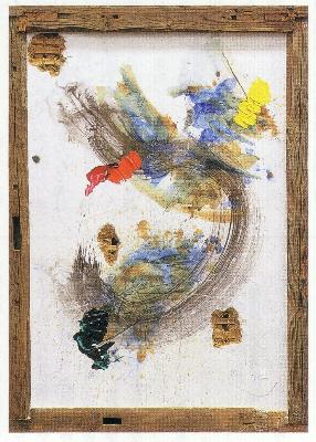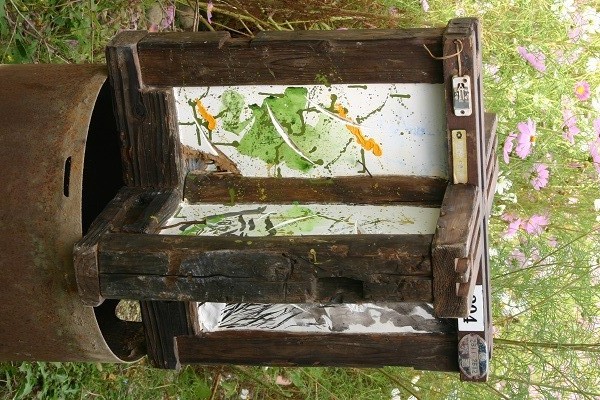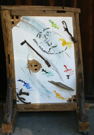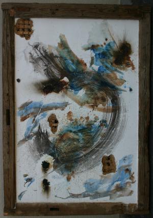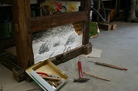 13 壁面に削りや刻み込みを入れる。 油絵具の一部をバーナーで焼く。![]() |
