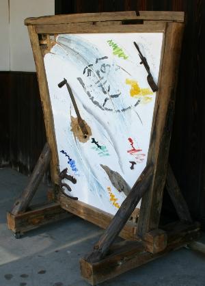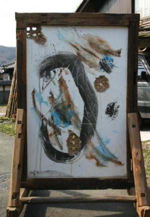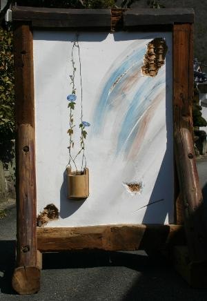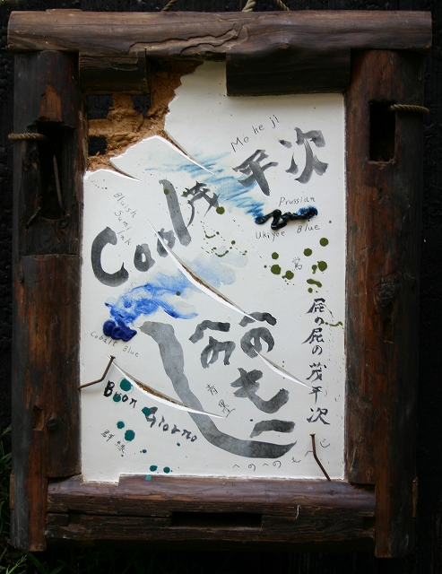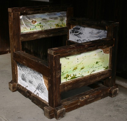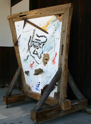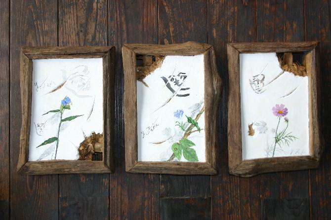 素材 medium 古民家廃木材 土壁(竹、稲わら、縄、土、漆喰) 岩絵の具 墨 油絵具 透明水彩絵の具 salvaged wood from an old farm house, bamboo, rice straw, mud, lime, Japanese rock color[Iwa-enogu], china black ink [Sumi], oil paint, water color