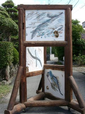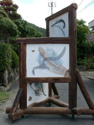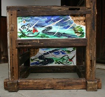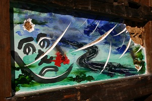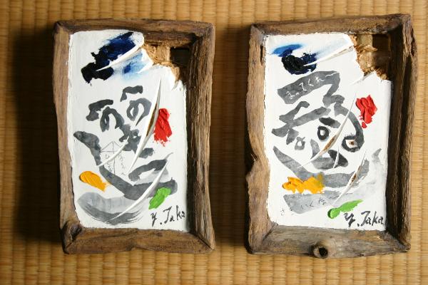 私が小学生の頃、生家の藁葺き民家が取り壊されて建て替えられた。二年あまりの間、常に木挽(こび)きや大工、左官の仕事を見ていた。この記憶から生まれるのがこれらの作品群です。 立て替えられた家の柱は何十年も保存されていた。これらの廃材を加工して木枠を組んだ。竹林から竹を切り出し、割竹を作った。これを木枠に格子状に挿し、 藁縄で編んでコマイを仕上げた。一時バイトをしていた建材店から仕入れた壁土を塗った。乾いた後、漆喰を塗り重ねて伝統的な日本白壁に仕上げた。これらは すべて私単独で仕上げました。 ある作品では、海の流木や、廃物錆物が壁の中に組み込まれた。おおむねの作品において、漆喰が生塗りの段 階で日本岩絵の具を用い、淡彩を施した。墨でモチーフが大書された。鉛筆で落書きを施すものもある。壁を穿って覗き穴を作ったり、いろいろなニュアンスの 切り込みを入れて平滑な壁面にアクセントを与えた。これにより、光と影でリズムが生まれてきます。 When Takahashi Yasuhiko [Taka] was a child, his aging family house was rebuilt. Taka spent countless hours watching the master Japanese carpenters Daiku and finish Sakan workers rebuild the old house. The salvaged wood has been carefully saved for decades. Taka’s wall arts are born from these elements. All of the work, from the building of wooden frames to applying the whitewash wall is done by Taka himself. Color is applied to the work using Japanese Rockcolor powder [Iwa-Enogu], a technique similar to Fresco painting. China black ink [Sumi] is also used to define the subjects in his paintings much like calligraphy. To give the work more texture and depth Taka will often cut, scratch and curve the surface of his paintings creating a sense of movement,rhythm and melody under a play of light and shadow.