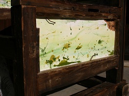 9 土壁が乾いた後、白漆喰を塗る。一部では、同時に水彩絵の具で白壁面を染める。![]() |