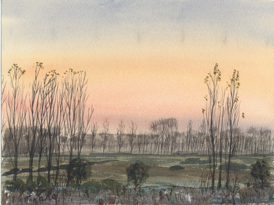 ユースホステルでは個室だった。2泊した朝、霜野となった快晴朝焼けの窓外光景をスケッチした。