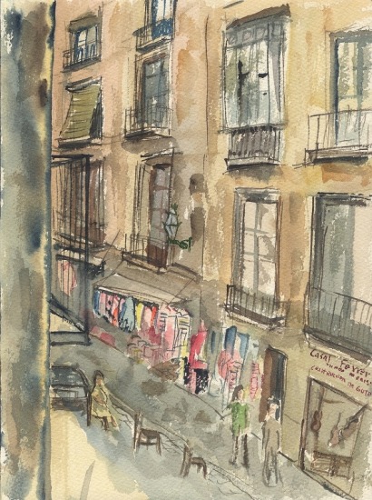 グラナダでの最初のスケッチで、アルハンブラ宮殿そばに取った宿の窓から見降ろしてのものだ。右下の店は楽器屋だろう。書き込まれた文字を読むに、ギター製造をしていると思われる。フラメンコの本場、グラナダにそぐわしい店だ。宿で申し込んだフラメンコ鑑賞ツアーを思い出す。穴倉のようなタブラオで見聞きしたフラメンコショーには強い感銘を覚えた。