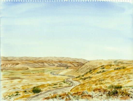 夕方、キャンプのテント近くから、下って又上るR40をスケッチする。走る車が猛烈な土埃を立てている。翌朝これを辿ったのだが、大石ゴロゴロで砂も深い極悪路だった。