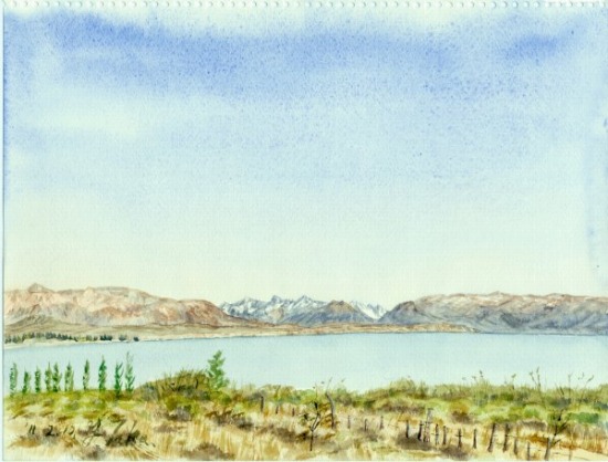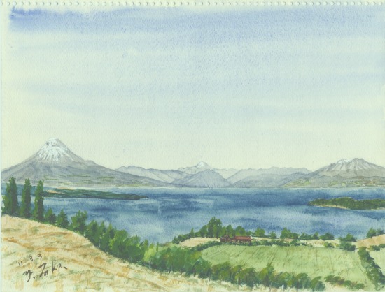 湖岸の町、プエルト オクタイから、道は湖岸を離れて丘に上がった。湖越しのチリ富士、オソルノ山をスケッチする。