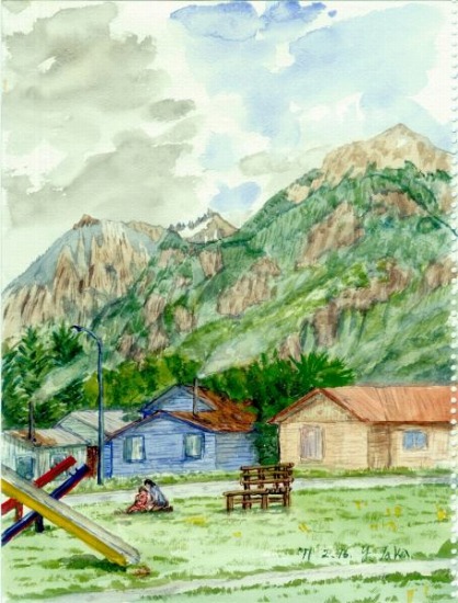 アメリカ南端の島フエゴ島の街、ウシュアイア。宿「上野山荘」から外に出てスケッチを始めたのだが、時雨れてきて宿に戻る。居間から窓外を眺めて、それなりになるように仕上げた。
