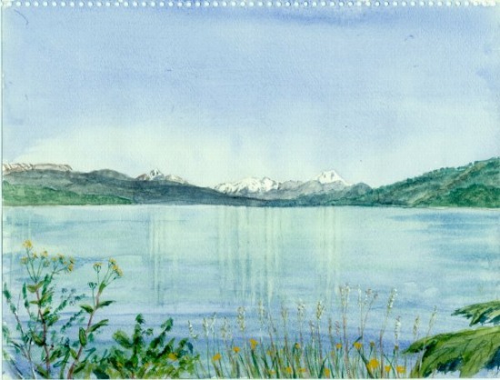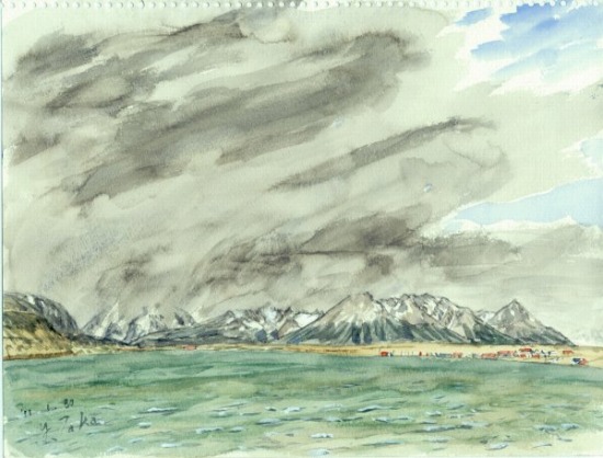 アイセン地方。穏やかだが海水。フィヨルド。道路工事で3時間以上の通行止めに会った。しかたがないからその場でスケッチする。時間待ちの工夫らしい男たちが絵を褒めてくれる。
