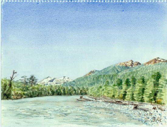 アイセン地方。川縁にキャンプして画材を開いた。アブが多くて、刺されまいと戦いながらのスケッチ。