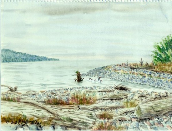チャイテンからのフェリーでチロエ島を目指す。フェリー待ちで海辺にキャンプした。 こぬか粉糠雨を避けて、テントの中からスケッチ する。雲が低く垂れ込め、近くにあるはずの雪山は見えない。蚊よけのためにテント前に流木をいぶす。対岸のチロエ島のラジオ局からの放送を聞きながら時間 をかける。小川が海に流れ込むあたりに、黒首白鳥の群れが漂っている。餌をあさ漁るに都合が良いのだろうか?