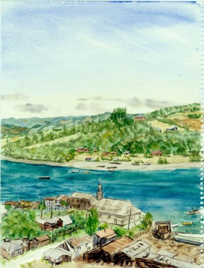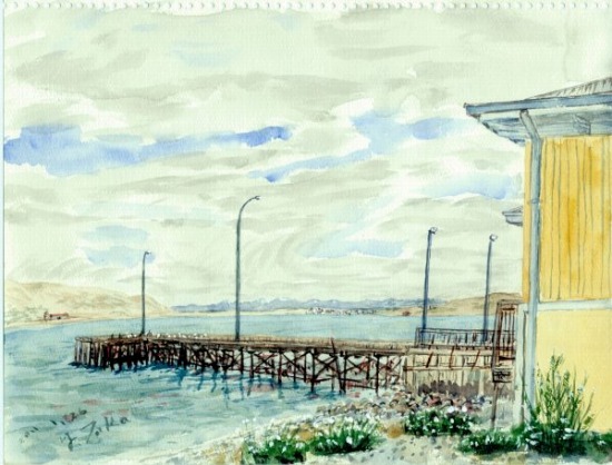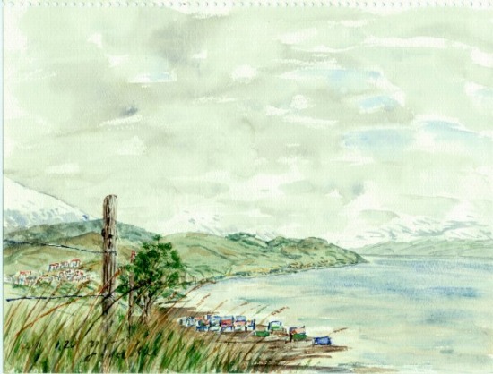 フエゴ島東端の街、ポルベニール。チリ本土に渡るフェリー乗り場が遠く、対岸に見える。その遠方に本土の山々が青薄く延びている。明日朝までフェリー待ちでのんびりなのだが、雨がパラついてきてあわただしくスケッチを終わらせた。
