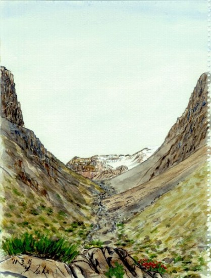 チリの首都、サンチャゴから、アルゼンチンへアンデス山脈を越える峠への往復小旅行に出かけた。峠から下ってきてキャンプした地点で朝にスケッチする。
