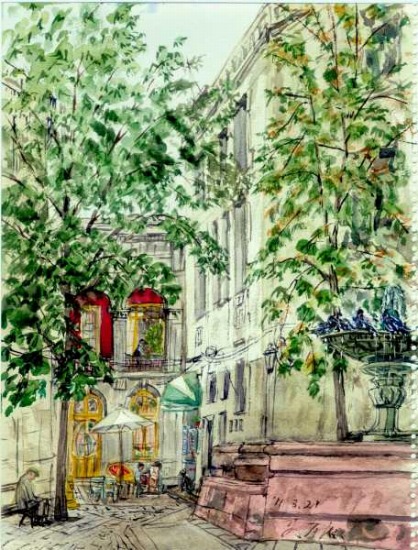 ブエノスアイレス、レティーロ地区。公園の中から、ブエノスアイレス一のファッション街、フロリダ通りの入り口を眺めてスケッチ。木々はハカランダで花期には紫の花を美しく、にぎやかに着ける。