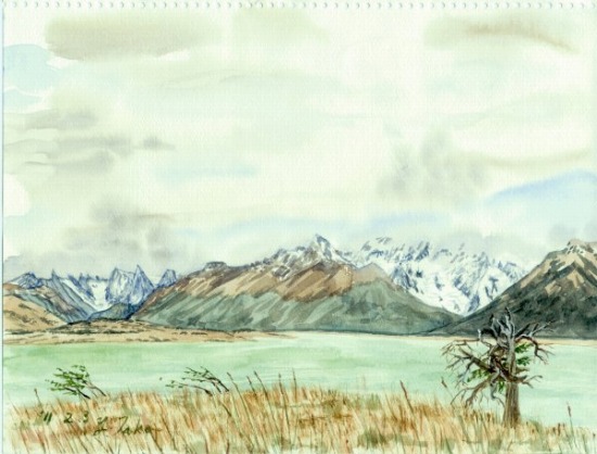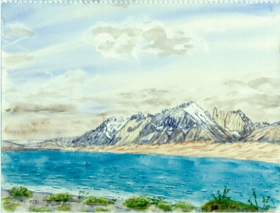 この山群に向かう土道からそれて湖岸にキャンプ地を探した。テントを張る前に、かつての氷河が残した湖越しの山群をスケッチする。