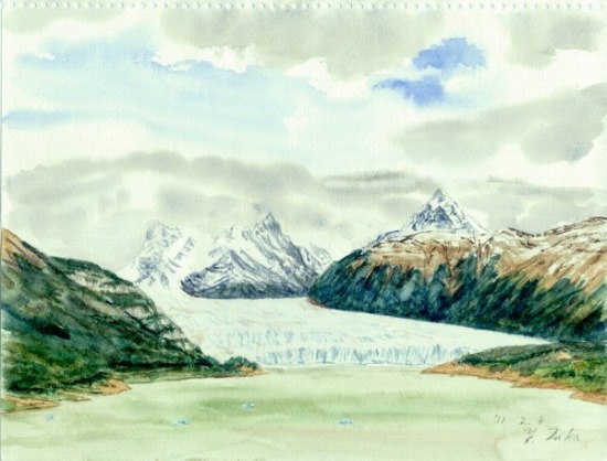 アルゼンチン。ロス グラシアレス国立公園内。リコ水道越しに見える氷河を抱く山々をスケッチ。右手の雪山の氷河は高名なペリト モレノ氷河の上部なのだろう。