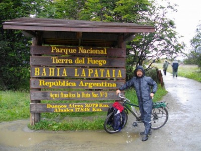フエゴ島。アルゼンチン国道最南端標示看板前にて。2011年1月