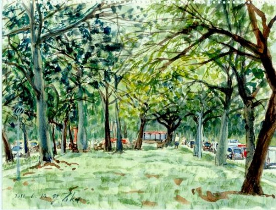 アルゼンチンの首都、ブエノスアイレス。世界一広いといわれる大通り。その中に幾筋も走る分離帯緑地のひとつに立つ樹の下でスケッチ。ミドリの樹皮と太鼓腹のような幹元を見せるのは、ボラチョ(酔っ払い)の木と言われるやつだろうか?