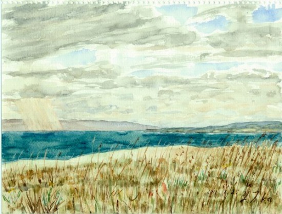 フエゴ島の東海岸。草原にキャンプし、スケッチする。雲、雨脚、陽光がめまぐるしく移り変わり、捕らえ辛い。寒く、草地のディテールを描き込みたいところだったが、あきらめて端折ってしまった。