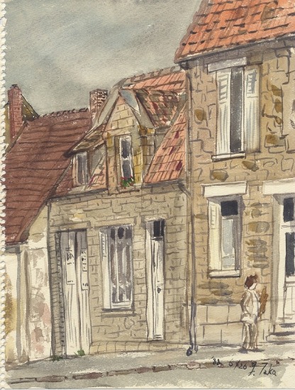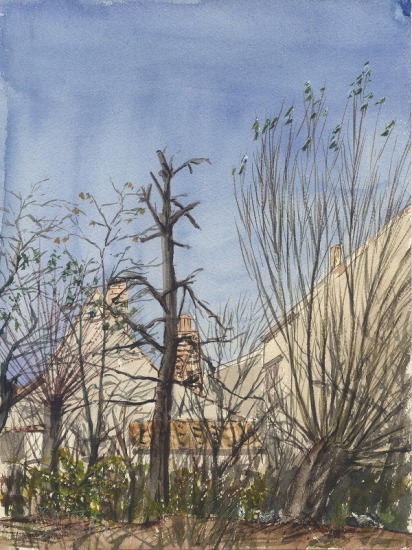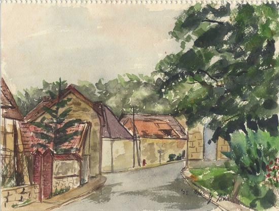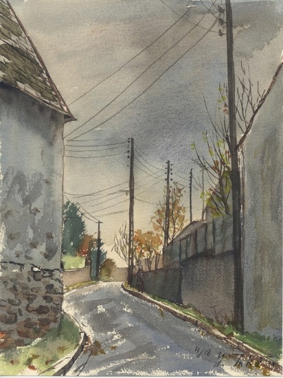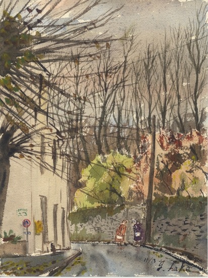 翌日朝、宿のそばでスケッチを始めた。スケッチを始めると少し時雨れてきた。夜中に雨が降ったのだろう、道に水溜りがある。ニースで雷雨に見舞われて以来の雨で、秋のパリあたりの、抱いていたイメージ通りの気象になった。低く雨雲が流れ、時雨れる。雲の合間に青空が現れる。
