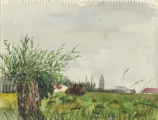フランスから国境を越えてベルギーに入った。自転車を停めて道端で昼休み、そしてついでにスケッチする。柳の木だろうか、胴切りされてなお枝葉を伸ばした樹の姿が印象深い。遠くに立つ塔はRoeselareの教会なのだろう。