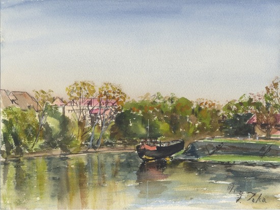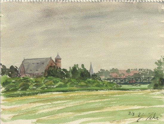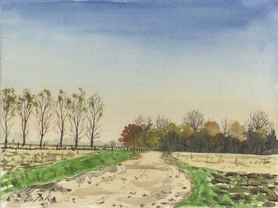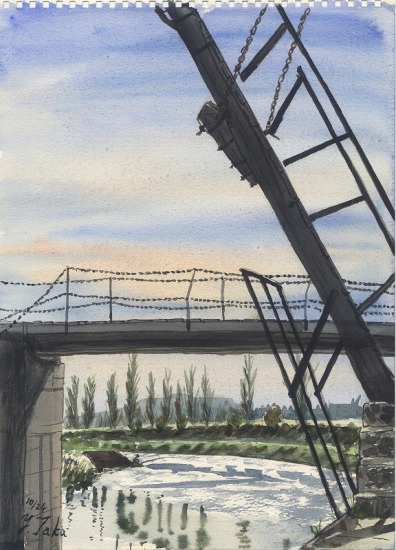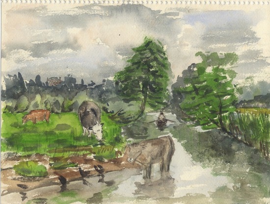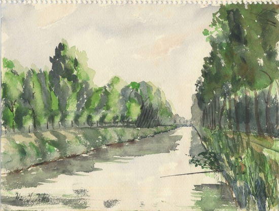 Peroneを少し北に出た田舎道。坂を登りきり、一息ついた道端でスケッチする。眼下の運河には、時々、はしけの様な荷舟が通う。背後は牛の放牧地で、白い牛どもが反芻している。その鳴き声は聞きなれた和牛のものとは違って、エキゾチックに聞こえる。