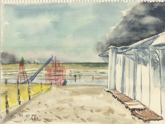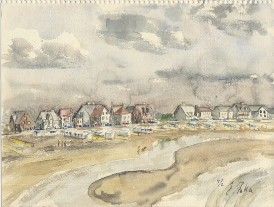 ジーブルージュに着き、北海に面する浜に出た。雨後の晴れ間にスケッチする。海に浸かっている子供が見えるが寒々しい。黒雲がその感を深める。