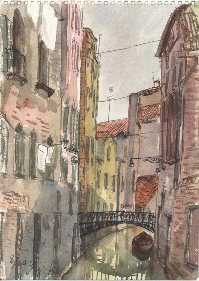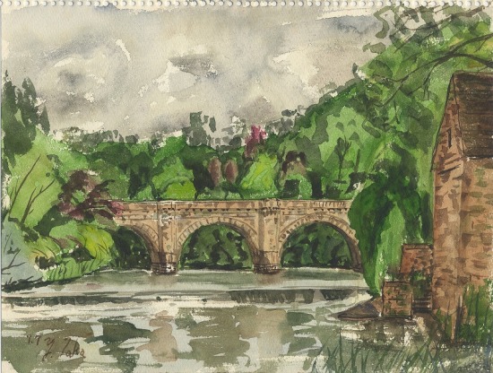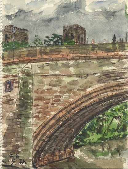 同じ橋を少し離れた位置からスケッチする。水面に映る緑陰とひなびた建造物。松江の城周りと同じ雰囲気だ。