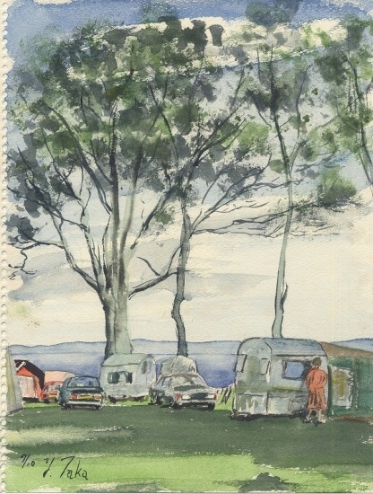 初めてのキャンプ場泊。テントを張り、シャワーも浴びて一息ついた。テントの後ろからキャンプ場の外をスケッチする。