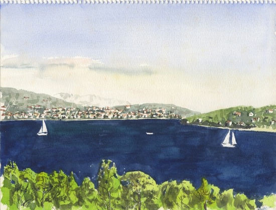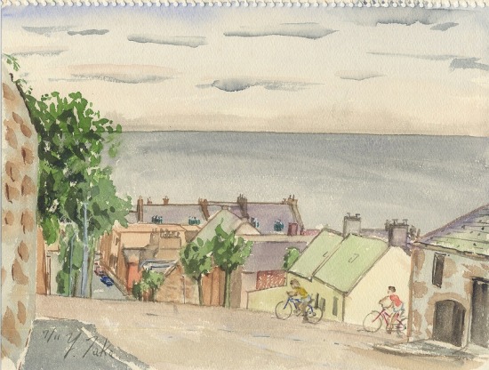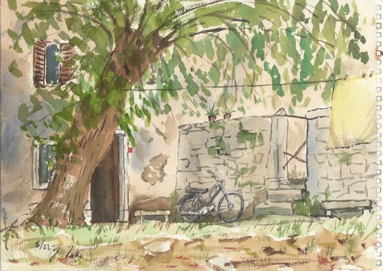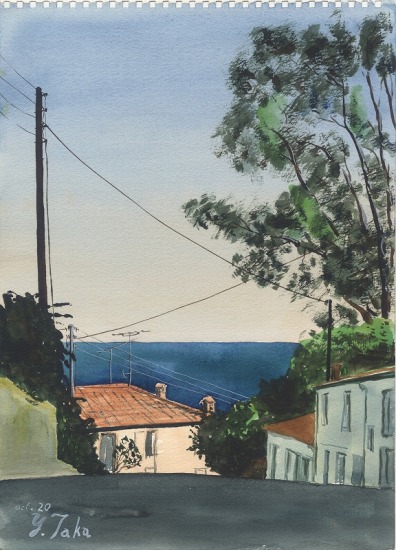 前日、ニースでとんでもない雷雨にあってずぶ濡れになって震えた。しかしその雨のおかげで、空気が恐ろしく澄んでいる。ただでさえ地中海地方は湿度が低くて空気が澄んでいるのに。カンヌの豪華さ、きらびやかさに驚かれながらに気持ちよく海岸線を西へと走ってきた。小さな町、トラヤまで来たが、あまりの美しさに、まだ数十キロしか走ってないが泊まることにした。ユースホステルがあることではあったし。(ニースのユースホステル同様にここのユースホステルも高見にあって、いずれも厳しい登りを、フル装備の自転車を押し上げたのだった。)ユースの宿泊カテゴリーにはテント泊があった。自分のテントを庭に張ってスケッチに出た。