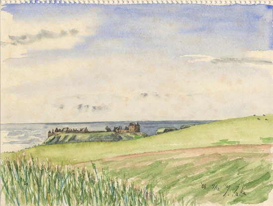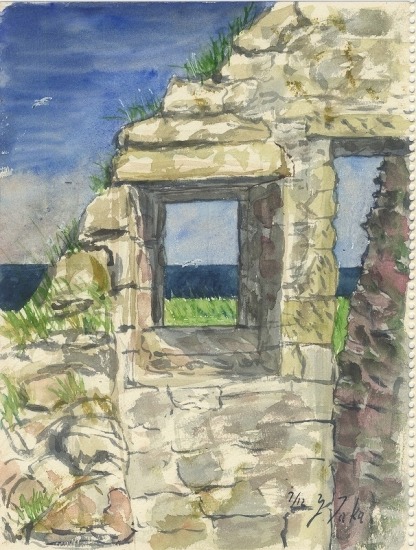 一昨年、北海に面したこの廃古城を訪ねて深い印象を抱き、スケッチもした。今年もやってきた。手持ちのランチを食べ、スケッチにかかる。風が強い。