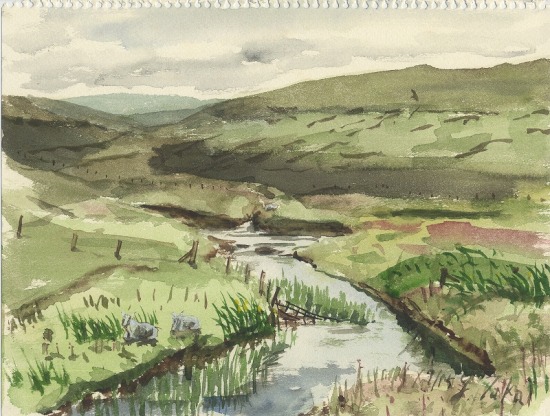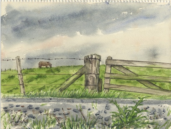 LerwickのYHに引き返す途中でもう1点のスケッチをした。流れるクリークの水は濃い茶褐色に濁っている。羊や牛の排泄物のせいのような気がするが、ピート(泥炭)から染み出るタンニンのせいらしい。染まった水は鏡の効果を増して、空の青や草の緑の映り込みを鮮やかに見せる。この流れは背後ですぐ、海に流れ込んでいる。そこで釣り人が糸をたれているのだが、釣れている気配が無い。