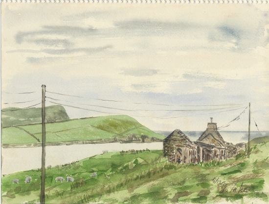 ランチを終えて先に進んだ。少々走ると道から爺様が羊の毛を刈るのが見えた。しばらく見物した後、ラーウィックに帰ろうと引き返した。が、すぐに自転車を停めてもう1点のスケッチをした。