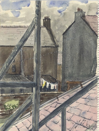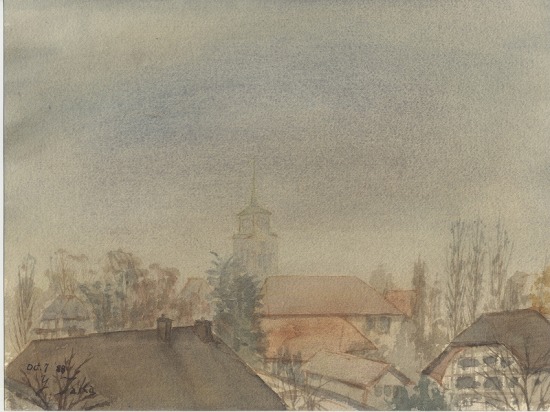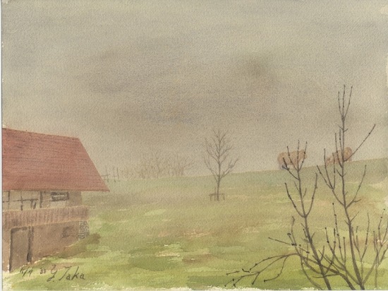 Jaeggi夫妻宅の窓外をスケッチする。この霧では、戸外スケッチは無理だろう。