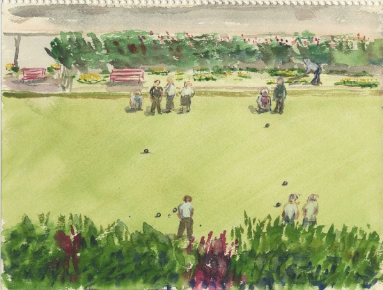スケッチの裏にはボーリングをしていると書き込んでいるが、鉄球を転がす、ヨーロッパ各地でよく見かけるこのゲームはペタンクと呼ばれるのだろう。