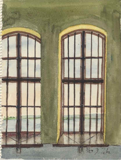 連続で、少し向きを変えてスケッチする。知人、Yaeggi夫妻宅の窓外スケッチ。