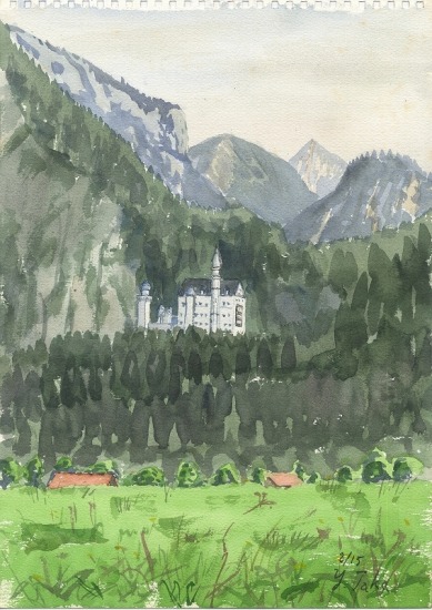 B&B連泊でダンノタースケッチ日にした。たっぷりした宿メシを頂き、下のスーパーで昼飯用食料を買い込んだ。店主は果物をサービスしてくれるし、天気は良い。気持ちよく、新しい2冊目のスケッチブックをバッグに入れた自転車で城に向かった。