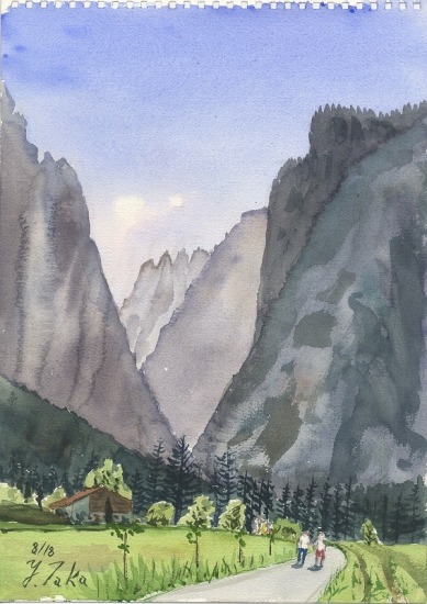 夕食後にあたりのスケッチを始めた。傾いた夕日は高い山肌だけを照らしている。夜露が降りてきたようであまりに紙面の乾きが悪く、途中ながらスケッチをやめた。