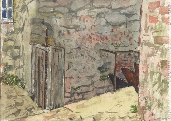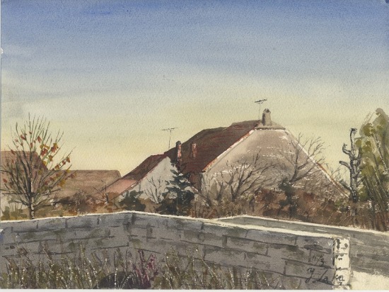 瓦屋根が面白い。瓦一枚一枚が形も大きさも色も違っていて、並べ方も雑然としている。じっくり描き込みたいところだが、端折ってしまった。