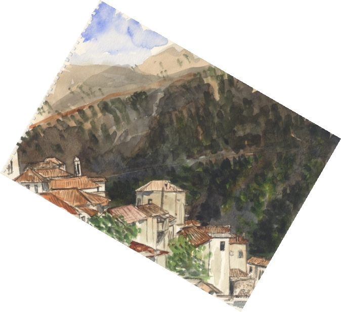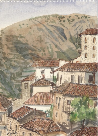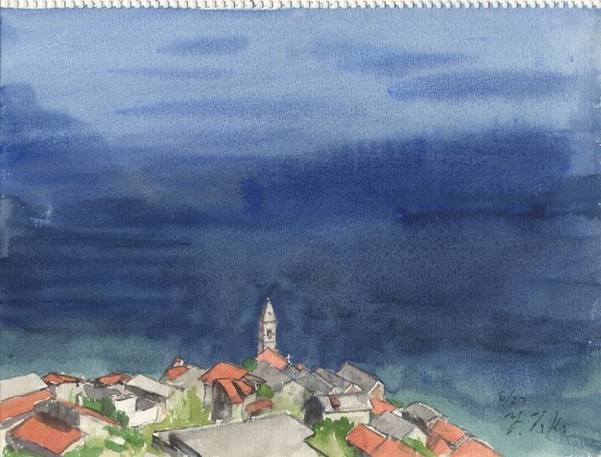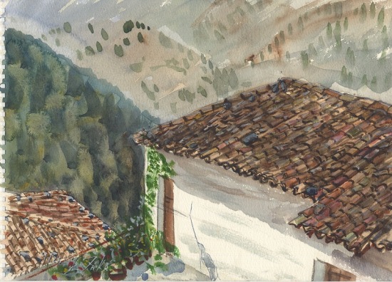 泊まっている宿の屋上からスケッチした。面相筆の穂先がちびて細い線が描けない。画面を斜めに使ってみた。