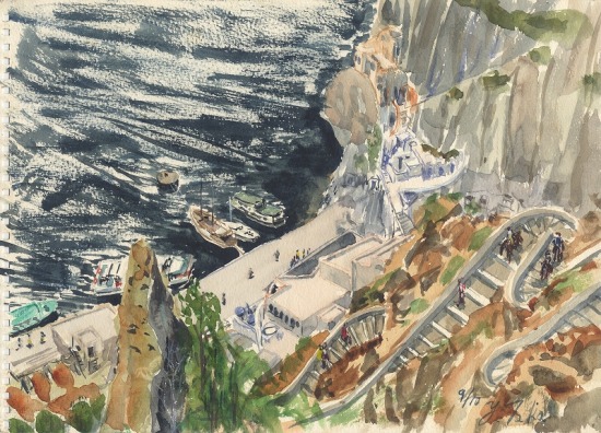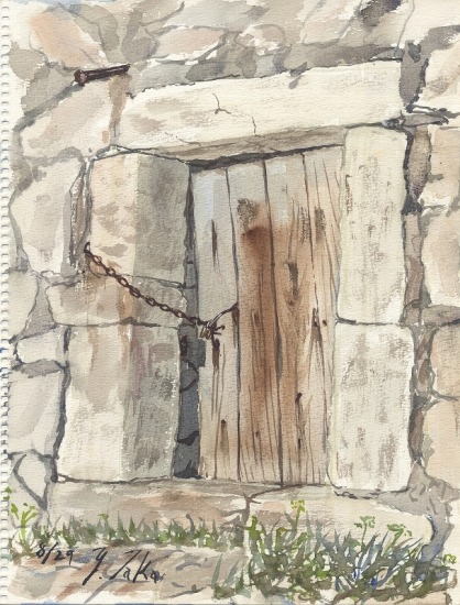 2点目を終え、海岸で手持ちランチを摂った。上に上がり、崖の間に渡した短い橋を渡って城内に入った。そして、スケッチを1点。