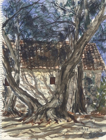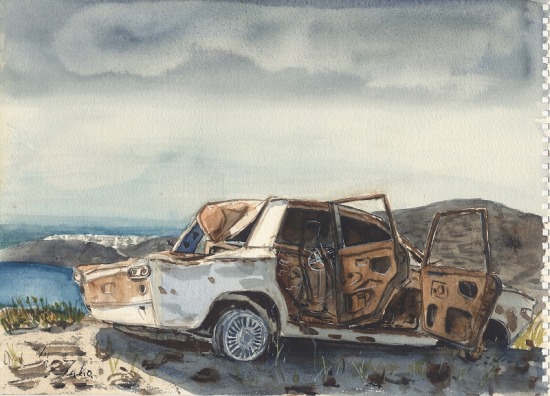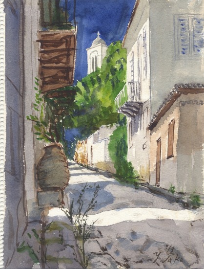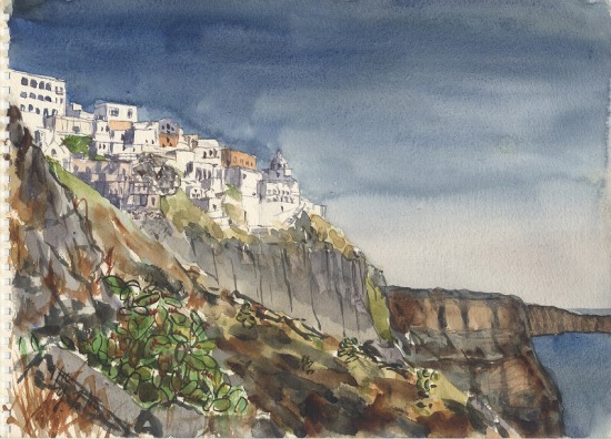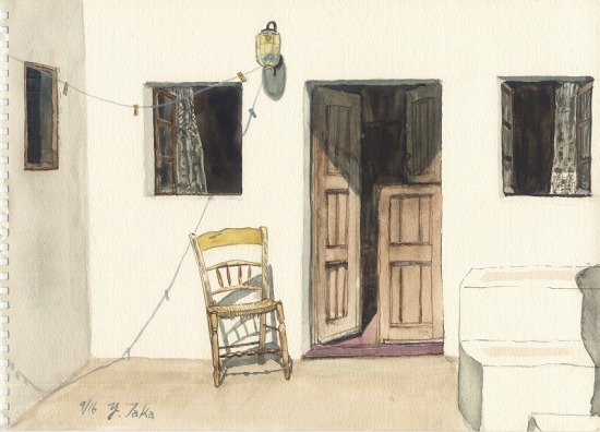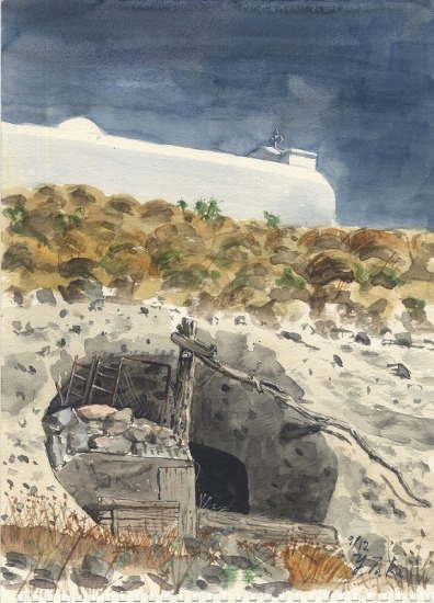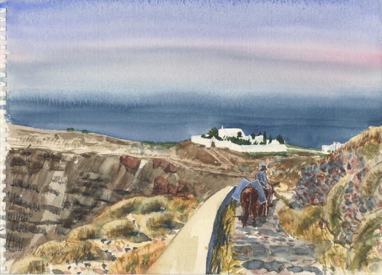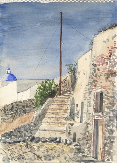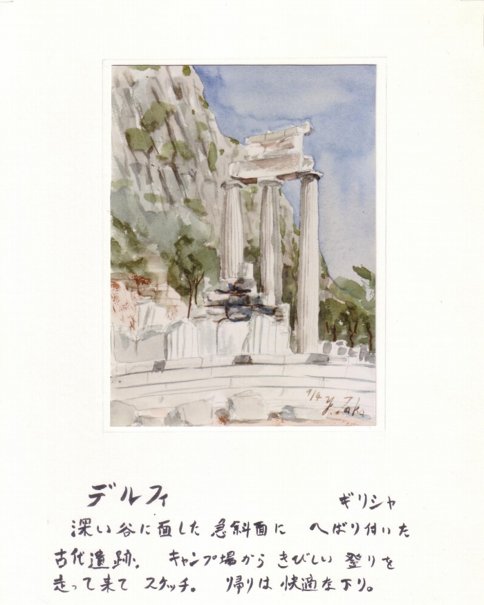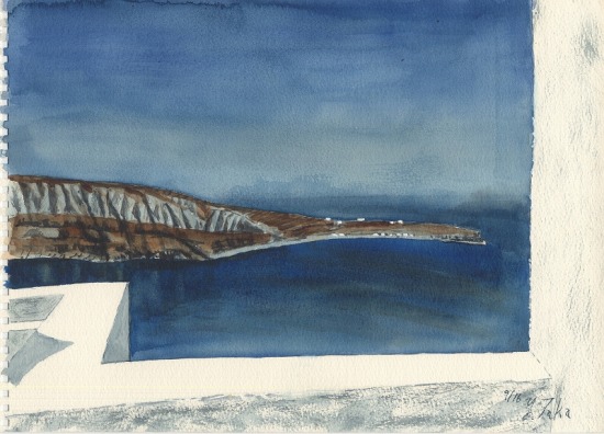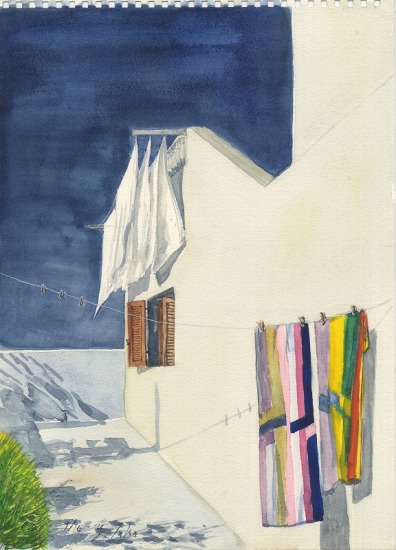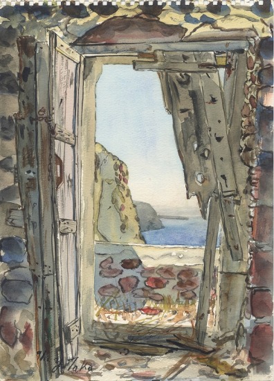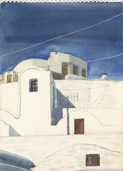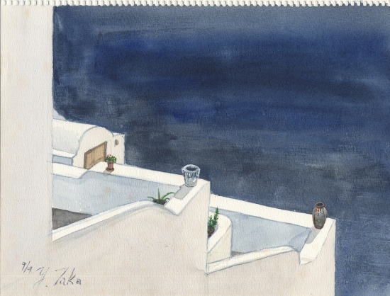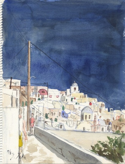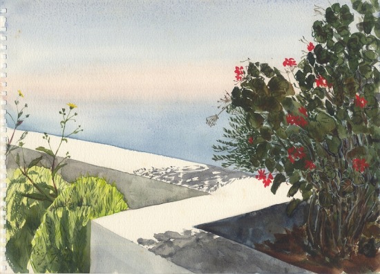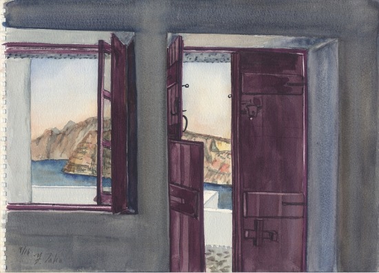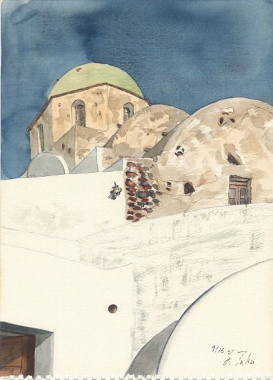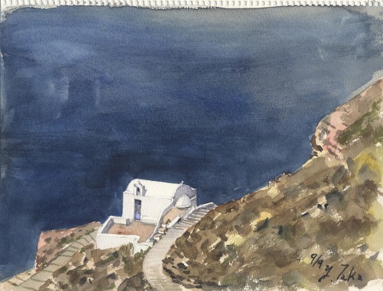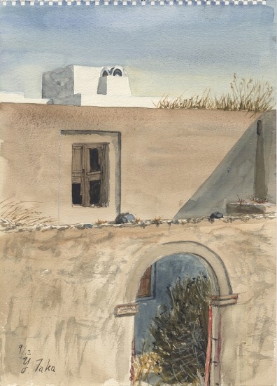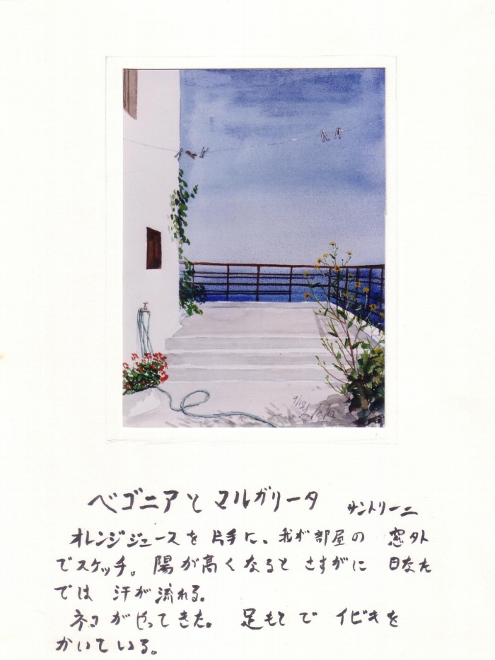 この後、夕暮れ時にYH自室窓外のスケッチをした。夜明けの朝焼け風景とほぼ同じ様な絵になった。傑作だった。しかし、この後、サントリーニで知り合ったスイス人と日本人妻の夫婦宅をスイスに訪ねたおり、滞在の返礼として請われるままにそれを譲った。