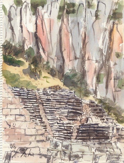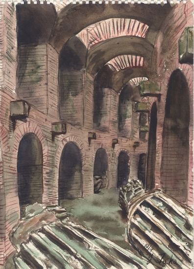 地下に少し入ってスケッチした。ポンペイと違ってここは観光客はろくにおらず、監視員もやってこない。落ち着いて、人目に触れることなくスケッチできた。湿気っぽい。昨夜の小雨でなおさらその感が強い。