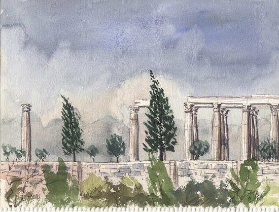 途中、にわか雨が降ってきて、ビニールシートをかぶってひたすら耐えた。雨がやんでスケッチ再開し、描き終えた。