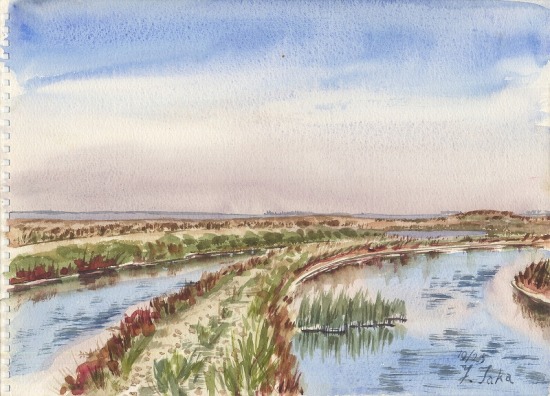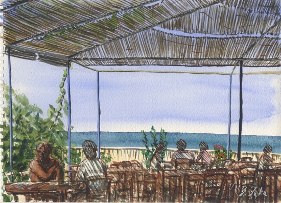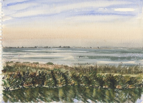 しこたまランチを食った後、スケッチを始めた。ところどころに魚網が仕掛けられた汽水の広大な沼に、フラミンゴが立っている。静かで音といえば、時折の飛行機を除けばフラミンゴやカモメなどの鳥の声だけだった。