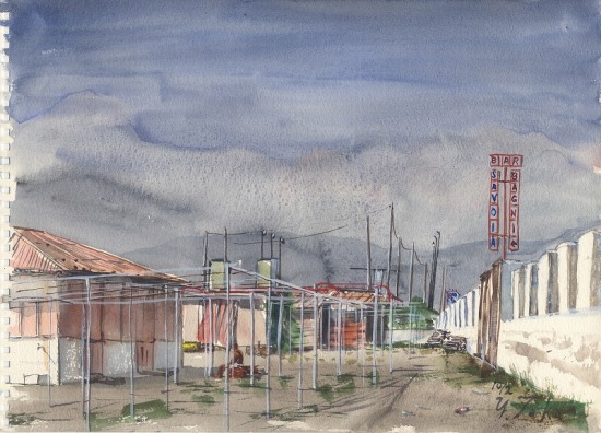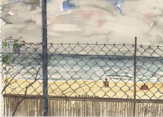 朝、20km以上続くという人影まばらな砂浜を散歩した。それからキャンプ場をスケッチした。湾岸の先にサレルノ市街が見える。見通しが利いてしまうキャンプ場は侘しい。放置された冷蔵庫と、無人のキャンピングトレーラーが侘しさをつのらせる。