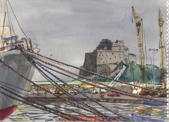 遺跡スケッチの後は海岸線を西に走ってバイーアの港へ行った。岸壁から城を見てスケッチした。アラゴンの時代からの城だそうだ。岸壁につながれた船は解体中か修理中で、働く人夫の一人が濃いエスプレッソコーヒーを差し入れてくれた。