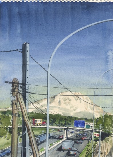 高速道路の上にかかる歩道橋の上でスケッチすることにした。セザンヌの絵でおなじみのサントビクトワール山だ。