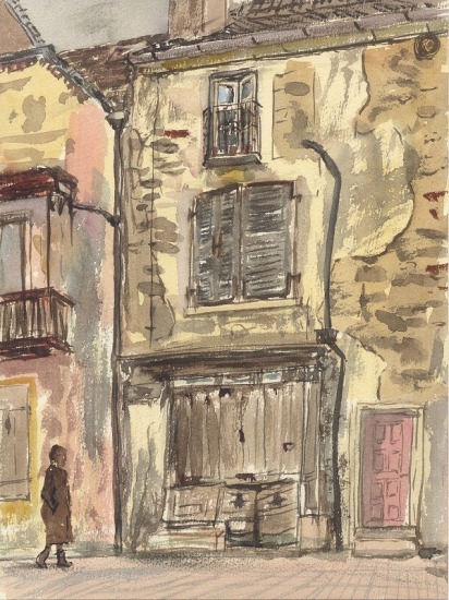宿は田舎街道の交差点にある。角向かいはPlace De La Republique公園になっている。公園縁のレンガ積み段に腰掛けて、ホテルをスケッチする。一階右端の窓が泊まっている部屋のものだ。その右手のドアの踏み石段に座り込んで、Rue De Parisを見降ろしてスケッチするのが次のスケッチになる。