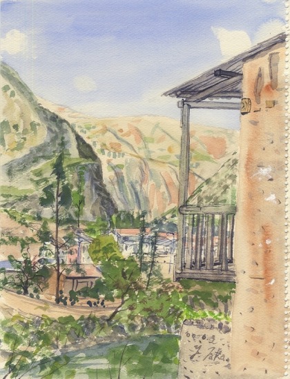 昨朝同様、朝食後に宿の屋上でスケッチ。南を向いて。昨朝同様、やはり霧雨が当たる。 10時前に終了し、みやげ物買いがてら、スケッチに出た。