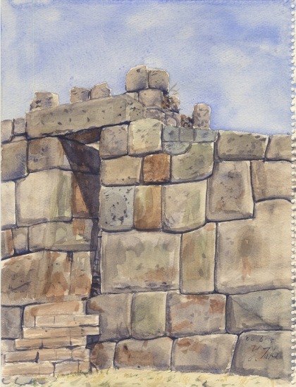 クスコ市内を見下ろす岡に残るインカの遺跡サクサイワマンの石積み。 巨岩の精緻な石組みには驚かされる。ガイドの説明が聞こえた。 ほかのは再建されたものだが、この門はオリジナルだそうだ。10時ごろからスケッチを始めた。始めは晴れていたが曇ってきた。 強い日差しが収まって、かえってラッキー。